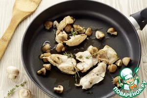 Нарезать куриное филе, шампиньоны и обжарить их на сковороде с добавлением масла, в конце жарки посолить, поперчить.