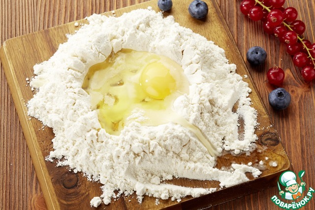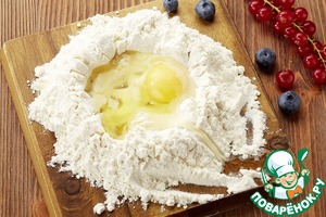Муку просеять, добавить разрыхлитель, соль, сахар, масло, яйца и вымесить тесто до однородной консистенции. Тесто должно получиться довольно крутым. После чего посуду с тестом накрыть пищевой пленкой и убрать в холодильник на 25 минут.