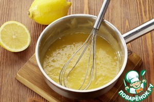 Приготовление крема: Снять с лимона цедру, выдавить сок. Лимонный сок вылить в сотейник, добавить цедру, сахар, два желтка, крахмал и поставить на умеренный огонь, при этом постоянно помешивая. После того как крем загустел, снять с огня и дать остыть.