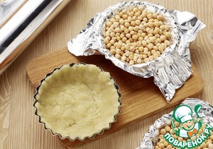 Тесто достать из холодильника, раскатать и выложить по маленьким формочкам для запекания. Поверх теста выложить фольгу, насыпать горох (это делается для того, чтобы при выпечке корзиночки не деформировались). Формы положить на лоток для запекания и запекать в духовке при температуре 1800С 15 минут. После того как корзиночки запеклись, выложить их на тарелку, дать остыть.