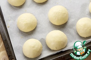 Как только тесто подошло, вытащить его из духовки, ещё раз вымесить, затем нарезать на небольшие кусочки по 50-60 грамм. Каждый кусочек закатать в колобок и выложить на лоток для запекания, предварительно положив на него пергаментную бумагу, затем накрыть пищевой пленкой и дать подойти 15 минут в тёплом месте. Как только тесто подошло, запекать при температуре 180 С 12-15 минут.
