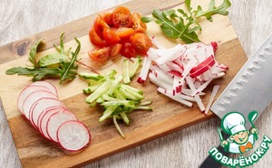 Порезать четвертинками черри, соломкой порезать огурец и редис.