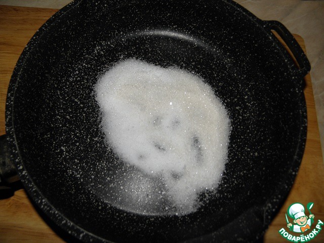 Готовим глазурь-маринад: Высыпать соль и сахар на сухую сковороду, поставить на средний огонь. Мешать, пока образуется карамель (только не пережечь) Не бойтесь, все это превратится в комочек