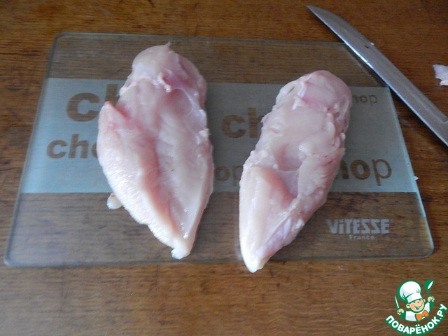 • Куриную грудку разрезать пополам.