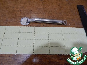 Раскатать тесто в полоски толщиной ~2 мм. Ножом разрезать тесто на полоски желаемой ширины. -