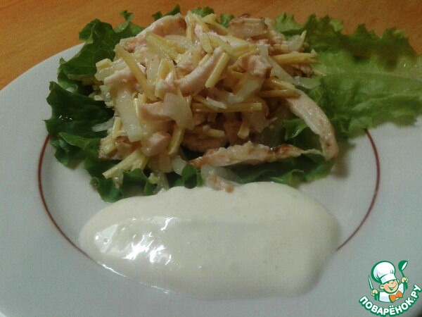 С лука сливаем маринад, добавляем лук к остальным ингредиентам, аккуратно все перемешиваем, солим по вкусу и выкладываем порционно на листы салата. Рядом кладем заправку (майонез, сметану или смесь того и другого), перемешиваем перед употреблением. Я теперь заправляю салаты домашним соусом а-ля майонез "Юлия", рецепт которого нашла на Поваренке. Приятного аппетита!