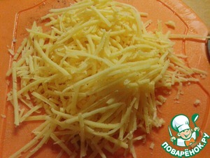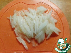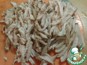 Куриную грудку также режем соломкой или (при желании) разбираем на волокна.