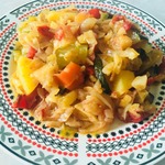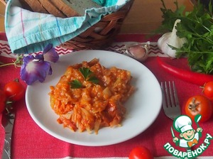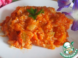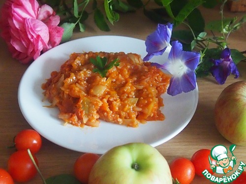 Все овощи сложить в кастрюлю к капусте и рису, хорошенько перемешать, залить томатным соком и тушить под крышкой на медленном огне примерно 45 минут до готовности. Овощи нужно часто перемешивать, так как жидкость собирается наверху и овощи могут пригореть. В случае надобности, подливать воду. Солить по вкусу.