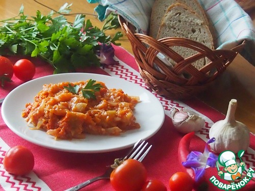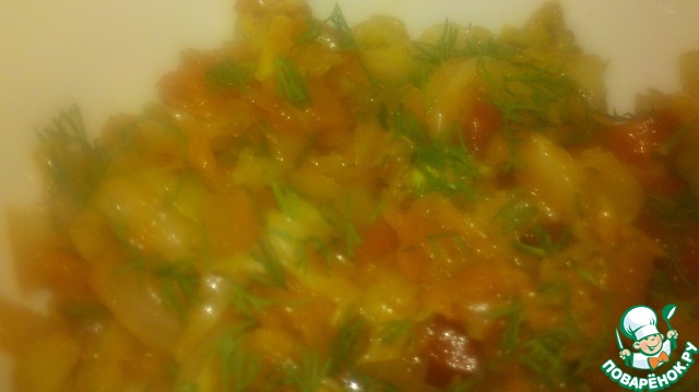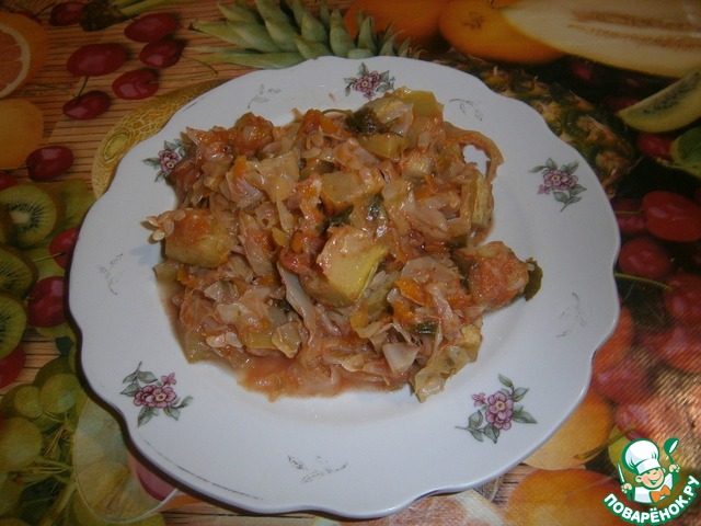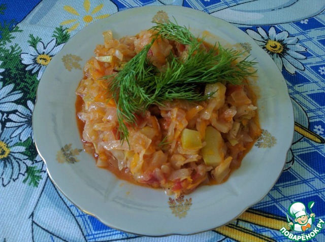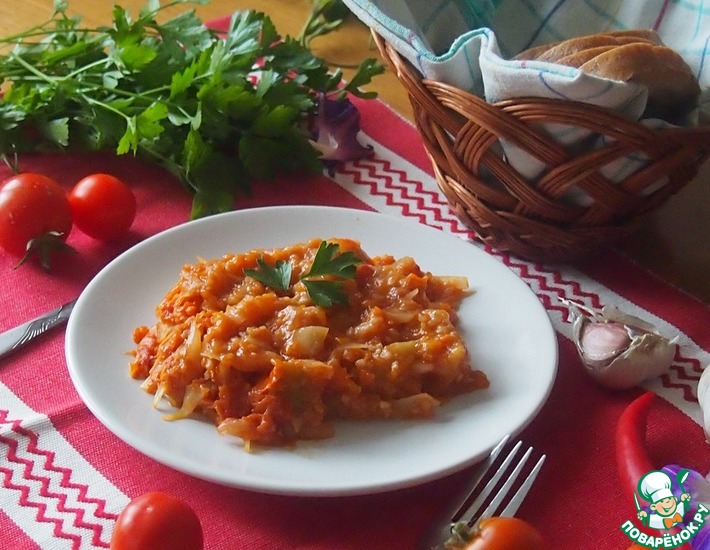 Я сразу скажу, что вес продуктов указан приблизительно, вы можете менять его в зависимости от своих предпочтений, от того, что имеется в наличии в данный момент и от размеров кастрюли. Рассчитывайте таким образом: половина от общего веса овощей - это капуста, а вторая половина - все остальное. Все овощи придется обжаривать, но недолго, только до тех пор, пока они уменьшат свой объем. Масло на сковороду наливайте всегда ложкой, не лейте из бутылки - так его израсходуете меньше.