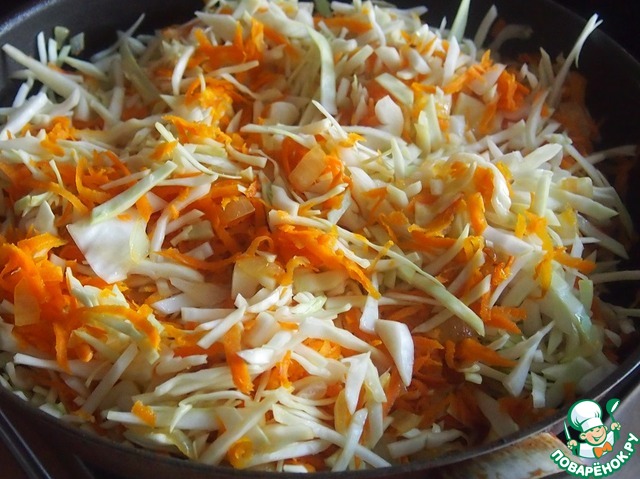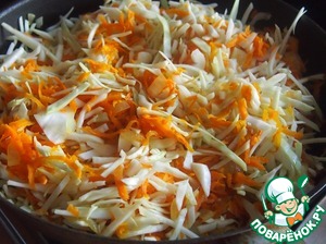 Капусту нашинковать, немного посолить и примять руками, добавить к луку и моркови. Если вся капуста не помещается, добавлять постепенно, в процессе тушения капуста уменьшит свой объем. Тушить под крышкой минут 15-20, периодически перемешивая. Если понадобится, подливать воду, чтобы капуста не пригорела.