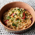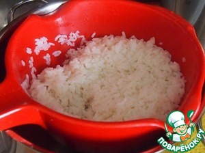 Тем временем стакан риса сварить в подсоленной воде до полуготовности, откинуть на дуршлаг и промыть холодной водой.