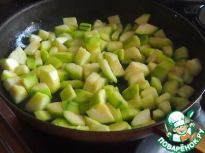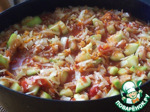 Подготовленную капусту и рис переложить в кастрюлю с толстым дном или казан, а на сковороде поджарить порезанные на кусочки кабачки. Молодые кабачки можно использовать с кожицей и семенами, а старые нужно очистить и удалить семена.