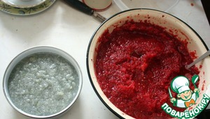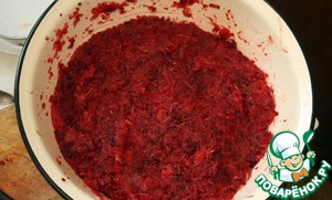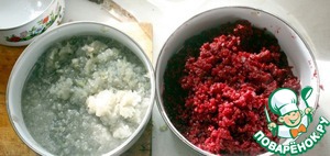 Лук и чеснок пропустил через мясорубку в одну тарелку, свёклу - в другую.