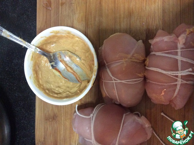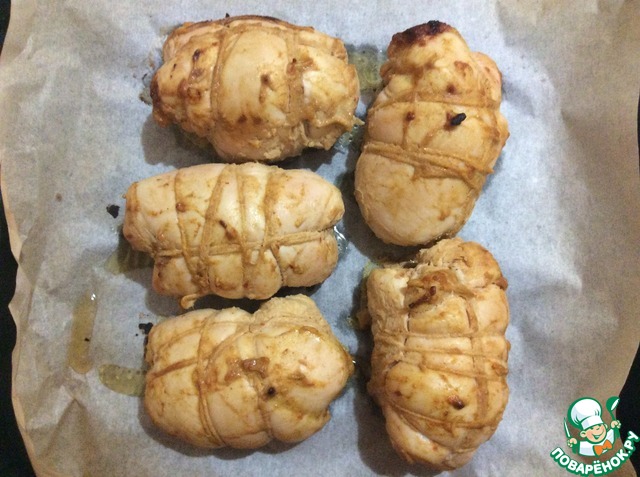 2)Достаём мясо, обсушим его бумажными полотенцами. Скручиваем филе плотно, рулетами и обвязываем кулинарной ниткой, плотно! иначе рулет потом будет разваливаться немного.