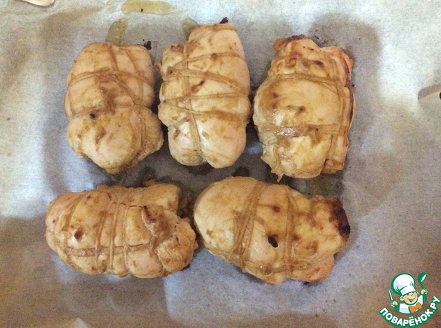 Прогреваем духовку 230-250градусов, у кого какая температура, на пергамент выкладываем наши рулеты и отправляем в духовку минут на 25-35.