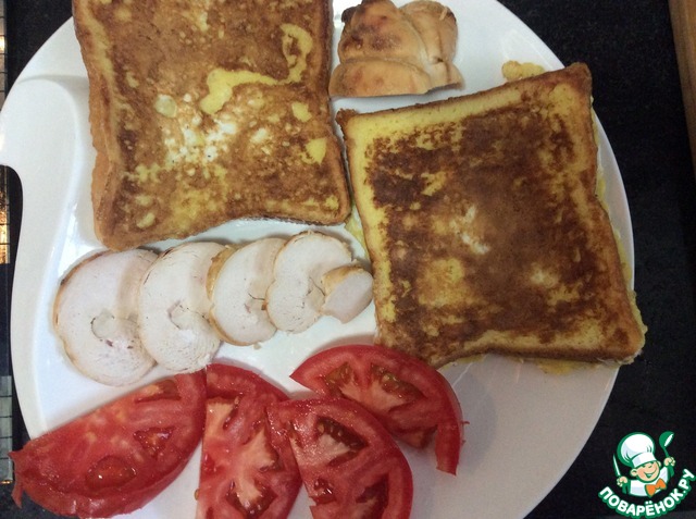 Взбиваем 3-4яйца, с солью и перцем, вымачиваем хлеб, чтобы он прям мягкий стал и обжариваем гренки до готовности. Смазываем чесночным соусом, добавляем соленые огурчики, лист салата, помидор и наше сочное мясо, можно посыпать сыром и получаем быстрый, вкусный и сытный завтрак!