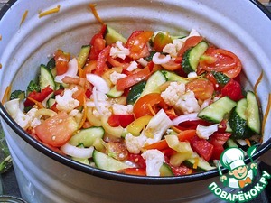 Особенно интересна в этом салате цветная капуста. Впрочем, кисло-сладкие помидоры и огурчики – ничуть не хуже. Да и лучок хрустит замечательно.