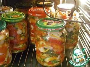 Затем наполняем банки овощами из кастрюли. Равномерно распределяем по банкам сок, накопившийся на дне кастрюли и накрываем банку стерильной крышкой. Стерилизуем салат. Большое количество банок удобно стерилизовать в духовке. Сигнал к окончанию прогрева - появление пузырьков в объёме банки и вытекание сока из-под крышки банки. Я держал банки в духовке при температуре 160 град в течение 45 минут. Достаём банки из духовки и укупориваем крышки герметично. Переворачиваем банки крышкой вниз и охлаждаем.