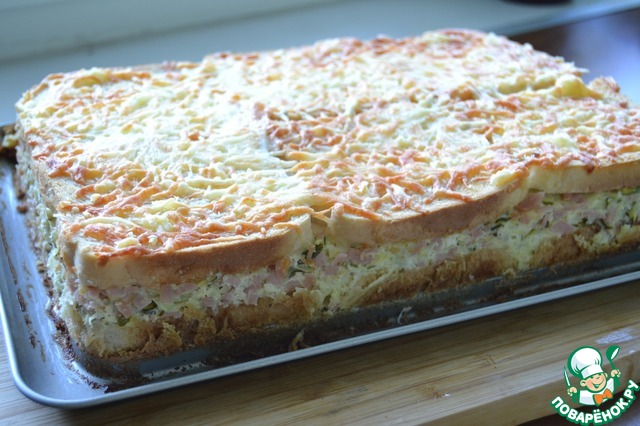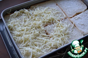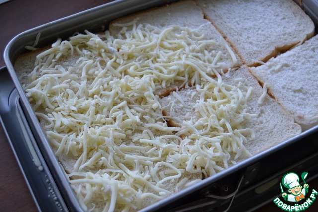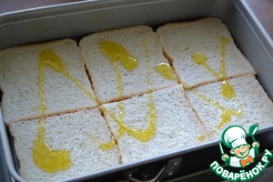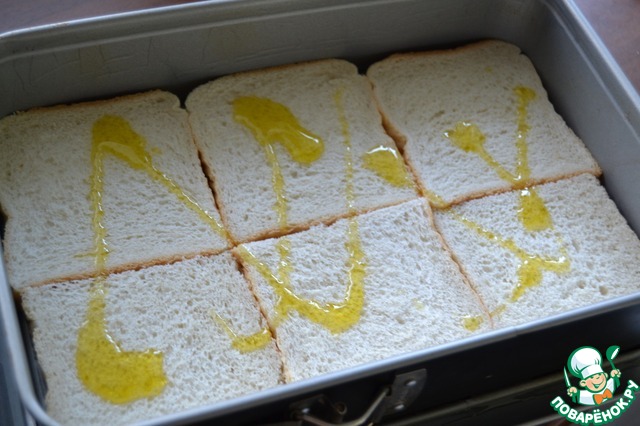 • Смазать форму. Выстилаем плотно 6 кусочков хлеба по дну.