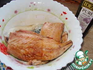 Скумбрию разделать на филе, замариновать в соевом соусе, с мирином и измельченным корнем имбиря. Маринуйте 1 час.