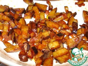 Пока рыба маринуется займемся баклажаном. Лук репчатый нарежем, обжарим на оливковом масле. Добавим порезанный баклажан, жарим, помешивая до готовности.