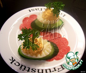 Огурец нарезать толстыми кусочками и ложкой сделать продольную выемку - чтобы яйцо не упало.