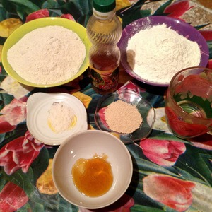 В миске развести дрожжи с водой, добавить соль, мед и уксус (именно яблочный). Добавить оба сорта муки и замесить тесто. -
