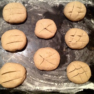 Разделить тесто на 8 частей. Сформировать булочки, сделав произвольные надрезы сверху. Выложить на чуть присыпанный мукой противень.