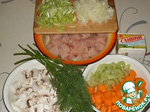 Подготовить продукты. Репчатую луковицу мелко нарезать. Шампиньоны очистить и нарезать пластинками. Черешки сельдерея очистить и нарезать кусочками, порей - полуколечками. Тыкву нарезать кубиками со стороной примерно 1,5 см. Мясо обмыть, обсушить и нарезать небольшими кубиками.
