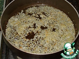 В глубокой сковороде нагреть растительное масло и обжарить лук до золотистого цвета.