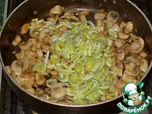 Затем всыпать порей и обжарить, помешивая, еще 1 минуту.
