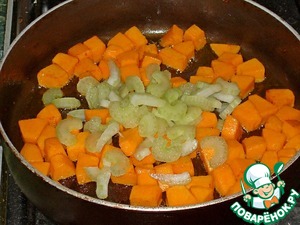 Добавить сельдерей, влить примерно 0,5 стакана воды или бульона.