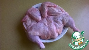 Курицу вымыть, промокнуть бумажным полотенцем, разрезать вдоль грудки и немного в районе грудки отбить. Посолить, поперчить.