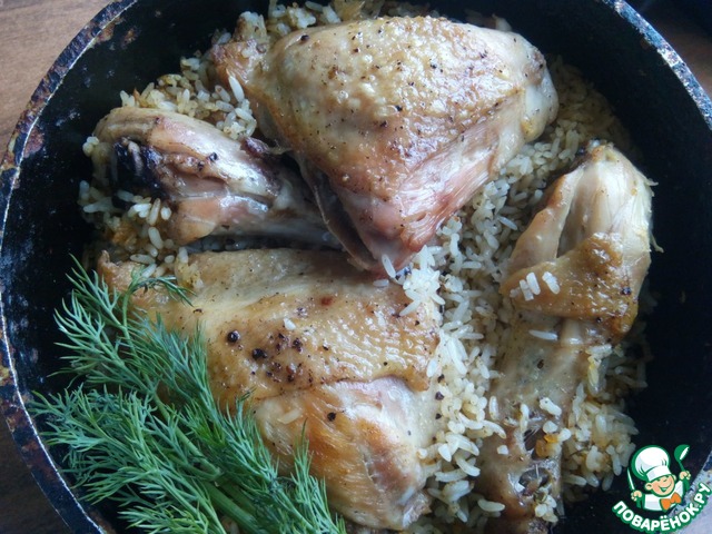 За основу взят рецепт курицы по-аджарски, состав и количество специй. Но я пошла дальше и сделала её с рисом. В итоге получилась мягкая, сочная курица и ароматный, пропитанный вкусом сливочного масла и пряных трав рис.