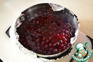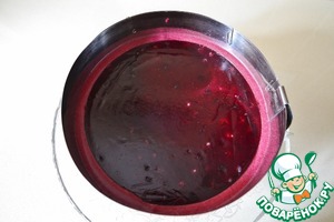 Если не против,процесс сборки можно упростить,собрав торт "вверх ногами",а потом готовый перевернуть на блюдо.Это намного легче,чем выкладывать желе на мусс и время экономит.