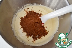 Затем добавляем 30 г муки и 25 г какао. Аккуратно перемешиваем.
