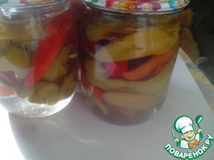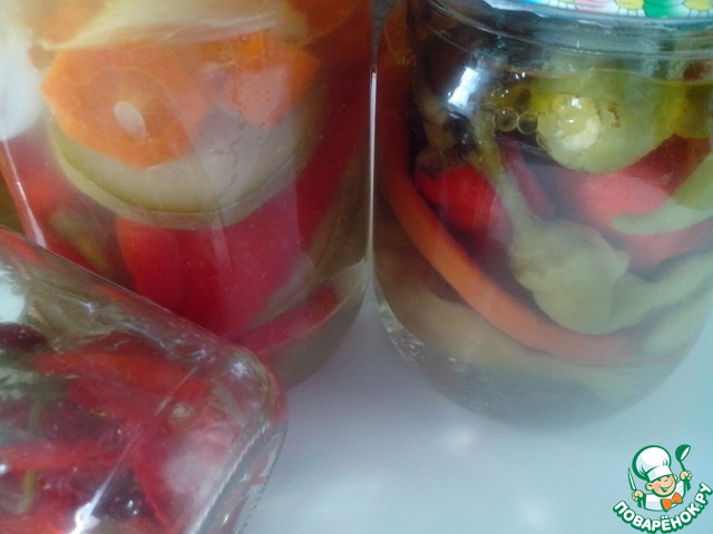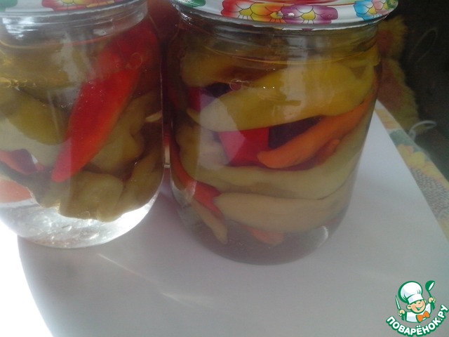 • А это фото прошлогодней заготовки. Перец получается не мягким, упругим. Рецепт рассчитан на 3 кг перца, я всегда укладываю перец не плотно, что бы баночку можно было за пару дней съесть и поэтому по весу перец "на глаз" беру. Если рассол остался я закатываю с ним любые овощи (на фото есть баночка). Например, кабачок (баклажан)+ перец болгарский+ помидор+ лук + морковь. Так же 5 минут проварила и закатала. Можно в маринад добавить стакан чеснока (резанного) + зелень (пучок) и закатать болгарский перец, очень вкусно выходит. В этом году я даже перец "Огонёк" закатала :) Экспериментируйте и наслаждайтесь!