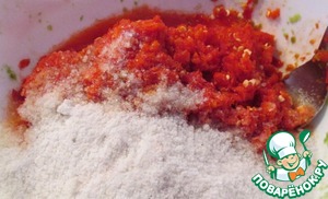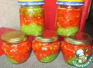 Перец вымыть, измельчить блендером. Можно измельчить все вместе, а я делаю отдельно красный перчик