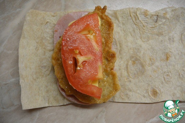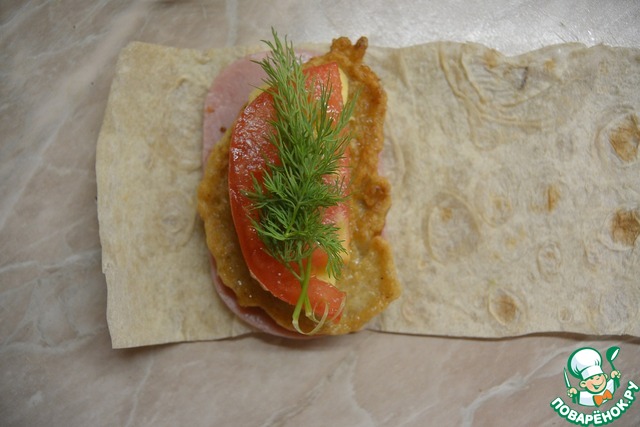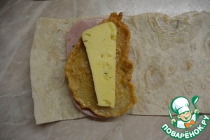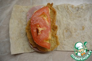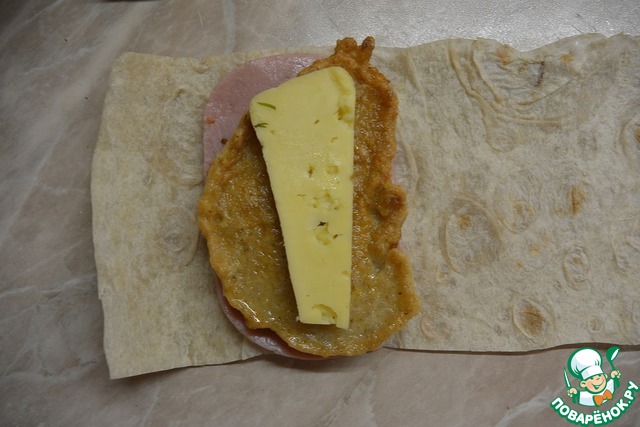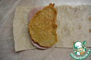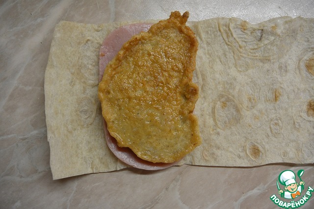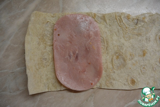 Ветчину нарезать на пласты. Выложить пласт ветчины на лаваш, немного отступая слева.