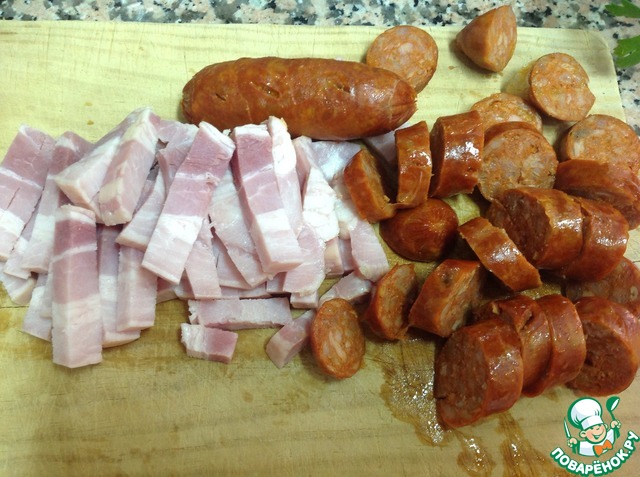 Колбаски чоризо довольно жирные, поэтому я их предварительно отвариваю 15 минут отдельно,