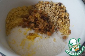 Смешать в мисочке хлопья, измельченные грецкие орехи, сахар, соль, изюм, цедру лимона и ванильный сахар.