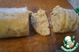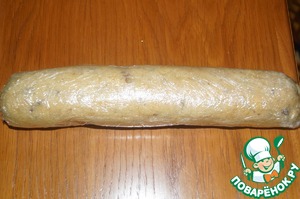 Смоченными в воде руками сформовать из теста "колбаску" нужного вам диаметра и завернуть её в пищевую пленку. Убрать колбаску в морозильную камеру на 30 минут.