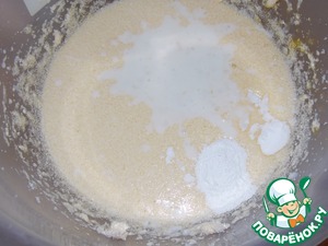 Положить яйца и кефир с хлопьями- взбить. Добавить соду и разрыхлитель, перемешать.
