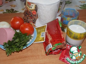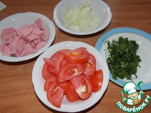 Подготовить начинку. Овощи, колбасу и зелень нарезать.