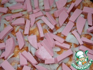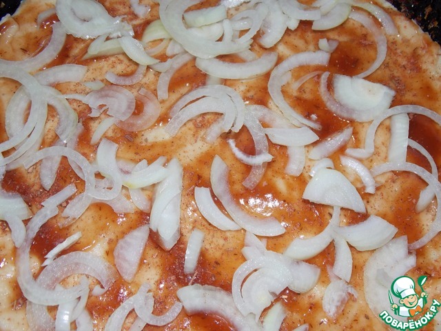 Тесто раскатать, выложить на противень, смазать кетчупом, посыпать приправой для пиццы, разложить лук.