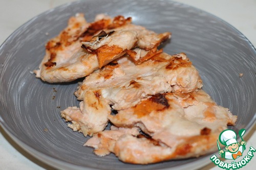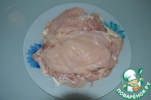 Нарезать мякоть курицы, отбить, так чтоб получились отбивные размером примерно с ладошку.