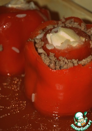 И доложить остатки риса и фарша по краям. Можно и ложкой, но удобнее руками. (Для ещё более эффектного результата, можно украсить сырной шапочкой). Выложить перцы на противень и залить примерно на четверть подсоленной томатной пастой, разбавленной водой. Поставить в духовку и при 180 градусах готовить около 20 минут.