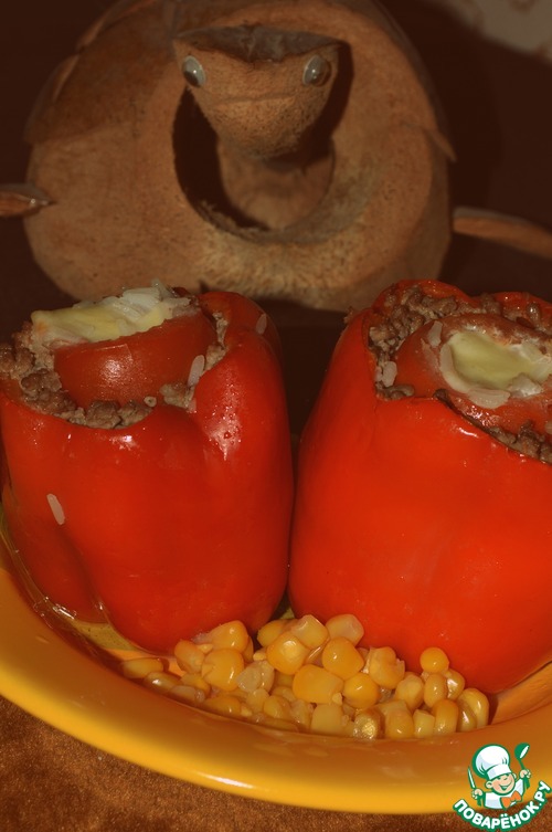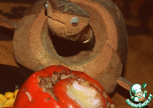 Эта милая черепашка, положившая глаз на фаршированный перчик, сделана из кокоса. Из скорлупы, конечно. Приехала она из Анапы, зовут Тюлей. Спокойная, домашняя, аллергии на пыль нет.