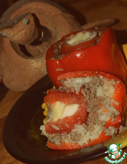 Вот такой вариант фаршированного перца, некая матрёшка в комлекте с гарниром и закуской. Вполне годится, как самостоятельное блюдо для лёгкого ужина.