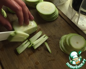 Кабачок режем соломкой и отправляем на разогретую сковороду с растительным маслом, переодически помешиваем.